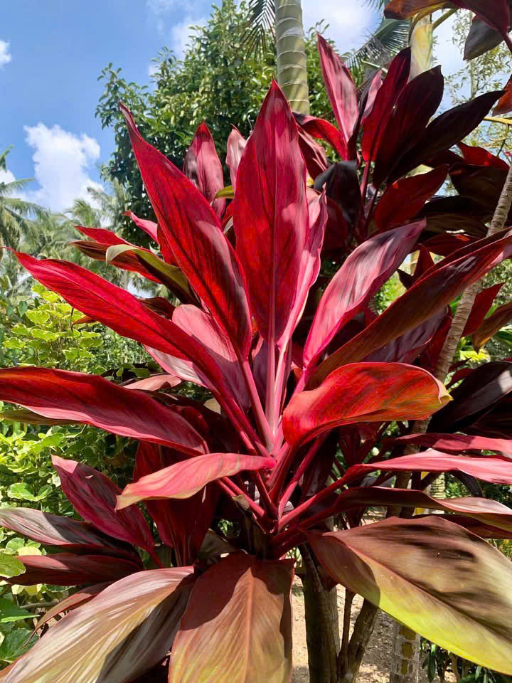 - Lá cây mọc tập trung thành 2 dãy ở ngọn cây, hình lưỡi kiếm. Lá cây có thể rộng đến 10cm và dài đến 50cm. Ở cả hai mặt đều có màu đỏ tía hoặc một mặt màu đỏ, một mặt màu xám.